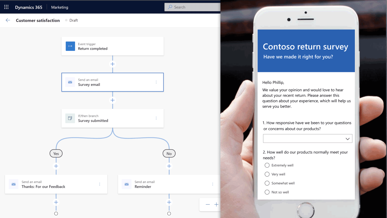 Design end-to-end journeys that increase engagement; Create personalized journeys using demographics and behaviors to orchestrate experiences across marketing, commerce, sales, and service. Act on feedback using Dynamics 365 Customer Voice.